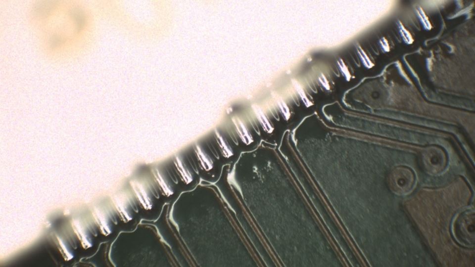 - lavoro costantemente con l’aiuto del microscopio, verificando che ogni pin sia ben saldato, isolato e senza ponti di stagno